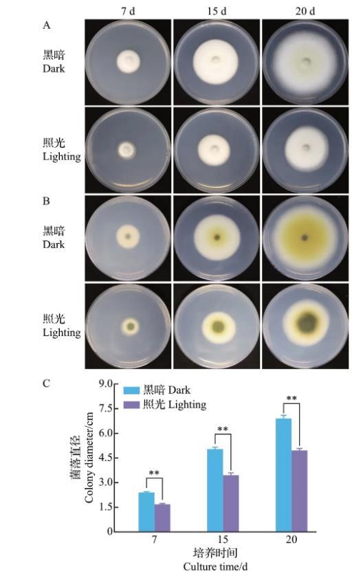 關(guān)于照光對稻曲病菌菌絲生長的影響,有研究報道了2種不同的結(jié)論。FU等和季宏平分別報道了照光對稻曲病菌菌絲生長的抑制作用;呂銳玲等和陸凡等的研究則得出,照光對稻曲病菌菌絲生長無影響。本研究發(fā)現(xiàn),照光組稻曲病菌菌絲的生長速率明顯低于黑暗組的生長速率,顯示照光可以抑制菌絲的生長,表明照光條件是該菌菌絲生長的調(diào)控因子之一。