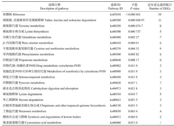 本試驗所得的DEGs被注釋到152個KEGG通路中,富集DEGs最顯著的20條通路見表4。在這20條通路中,核糖體通路涉及的DEGs有59個,明顯多于其他的KEGG通路。但在除核糖體通路外的其余19條通路中,發(fā)現(xiàn)有8條通路與氨基酸代謝有關(guān),涉及53個DEGs。上述結(jié)果說明,照光抑制稻曲病菌菌絲的生長可能與核糖體結(jié)構(gòu)和功能,以及氨基酸代謝受到影響有較大關(guān)系。
