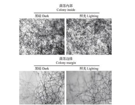 對在PSA平板上培養(yǎng)7、15、20 d后的ZJ09菌株菌落直徑進(jìn)行測量,結(jié)果表明:黑暗組和照光組的菌落直徑差異顯著(P<0.01),培養(yǎng)7、15、20 d后照光組的菌落直徑都顯著小于黑暗組的菌落直徑(圖1)。用顯微鏡觀察2組菌落,比較其菌落內(nèi)部(非邊緣區(qū)域)可以看到,2組菌落的厚度、菌絲密度無明顯差異;從菌落邊緣可以看到,2組菌落的菌絲在粗細(xì)、分支情況方面都未見明顯差異(圖2)。由此可得,照光組和黑暗組稻曲病菌的菌落直徑有顯著差異,反映出二者菌絲生長速率不同,表明照光可以明顯抑制稻曲病菌菌絲的生長。
