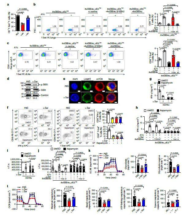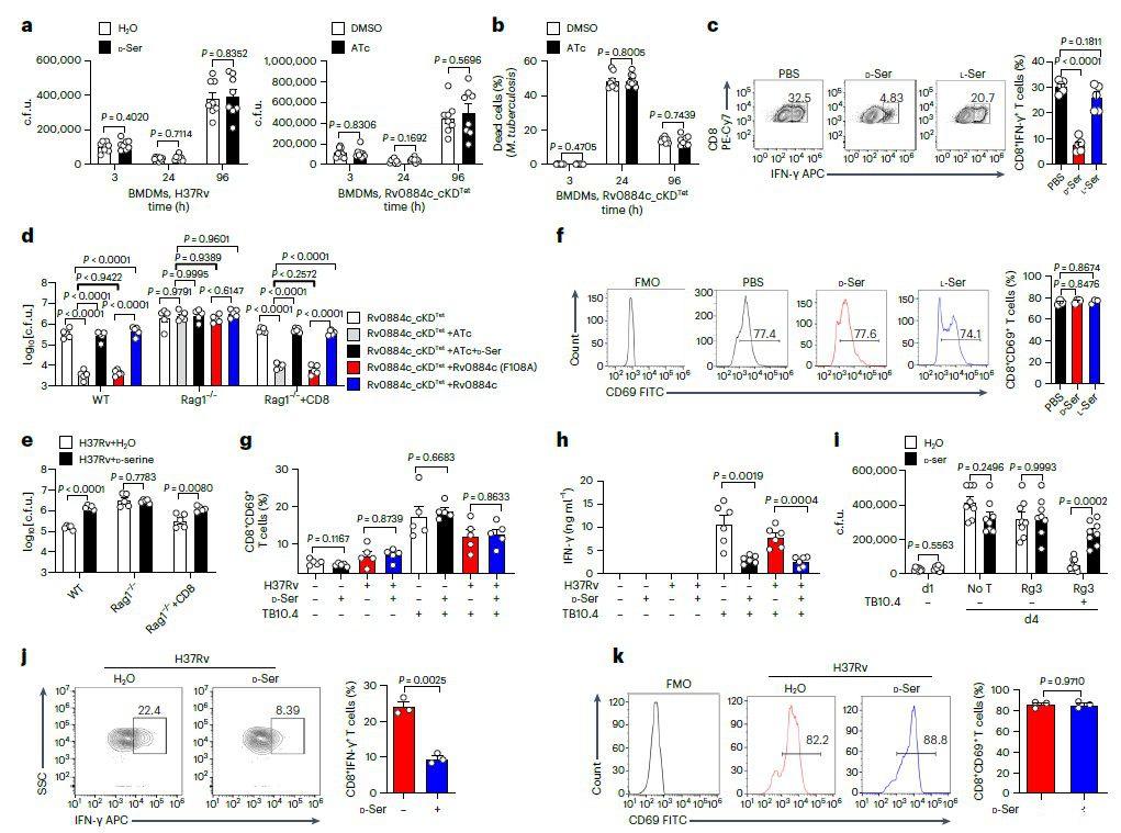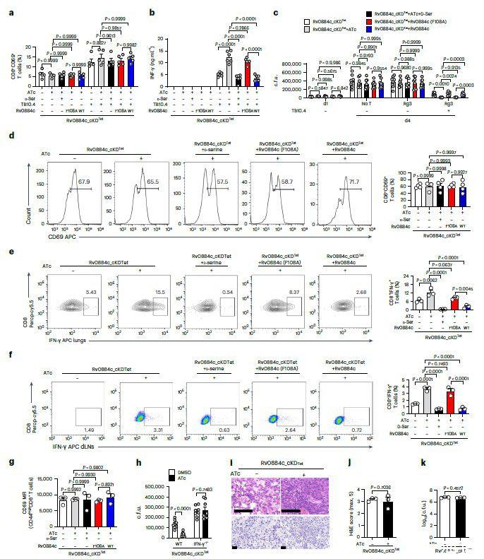 圖3、a,使用cfu測定評估用或不用D-絲氨酸(10mM)處理的BMDM中的H37Rv(左)或用或不用ATc處理的BMDM中的Rv0884c_cKD Tet(右)的細胞內存活。b,使用LIVE/DEAD BacLight細菌活力試劑盒測定BMDM中用或不用ATc處理的Rv0884c_cKD Tet的細菌活力。c,f,在IL-2和IL-12 p70存在下用抗CD3和抗CD28抗體激活和分化幼稚CD8+T細胞5天,并用PBS、D-絲氨酸或L-絲氨酸處理。測定了IFN-γ+(c)和CD69+(f)CD8+T細胞的百分比。APC,別藻藍蛋白。d、e、WT小鼠、Rag1?/?小鼠和Rag1?/?過繼轉移CD8+T細胞(Rag1?/?+CD8)的小鼠,用約200 cfu的指定Mtb菌株氣溶膠感染(d、Rv0884c_cKDTet和或無ATc、Rv0884c_cKDTet+Rv0884c(F108A)與ATc、以及Rv0884c_cKDTet+Rv0884c與ATc;e、H37Rv)或用D-絲氨酸處理。使用cfu測定確定感染后4周肺組織中的細菌負荷。g,將H37Rv感染的BMDM(MOI=5)和用或不用D-絲氨酸處理的活化的TB10Rg3 T細胞共培養(yǎng)2小時后,測量TB10Rg3 T細胞中CD69+TB10Rg3 T細胞的百分比。h,將H37Rv感染的BMDM(MOI=5)和用或不用D-絲氨酸處理的活化的TB10Rg3 T細胞共培養(yǎng)3天后,使用ELISA測量IFN-γ的表達。i,感染Mtb菌株1天后,將BMDM與用或不用D-絲氨酸處理的活化TB10Rg3 T細胞共孵育3天,并測定感染1或4天的BMDM中的細胞內cfu。無T,未脈沖的BMDM組感染H37Rv 4天,未與T細胞共孵育;d1,感染H37Rv 1天且未與T細胞共孵育的未脈沖BMDM組;d4,感染H37Rv 4天的BMDM組;Rg3,用H37Rv感染4天并與TB10Rg3 T細胞共孵育的脈沖或非脈沖BMDM組。j、k、C57BL/6小鼠用每只小鼠約200 cfu的H37Rv氣霧感染,并給予D-絲氨酸4周。測量肺組織中IFN-γ+(j)和CD69+(k)CD8+T細胞的百分比;FMO用作對照