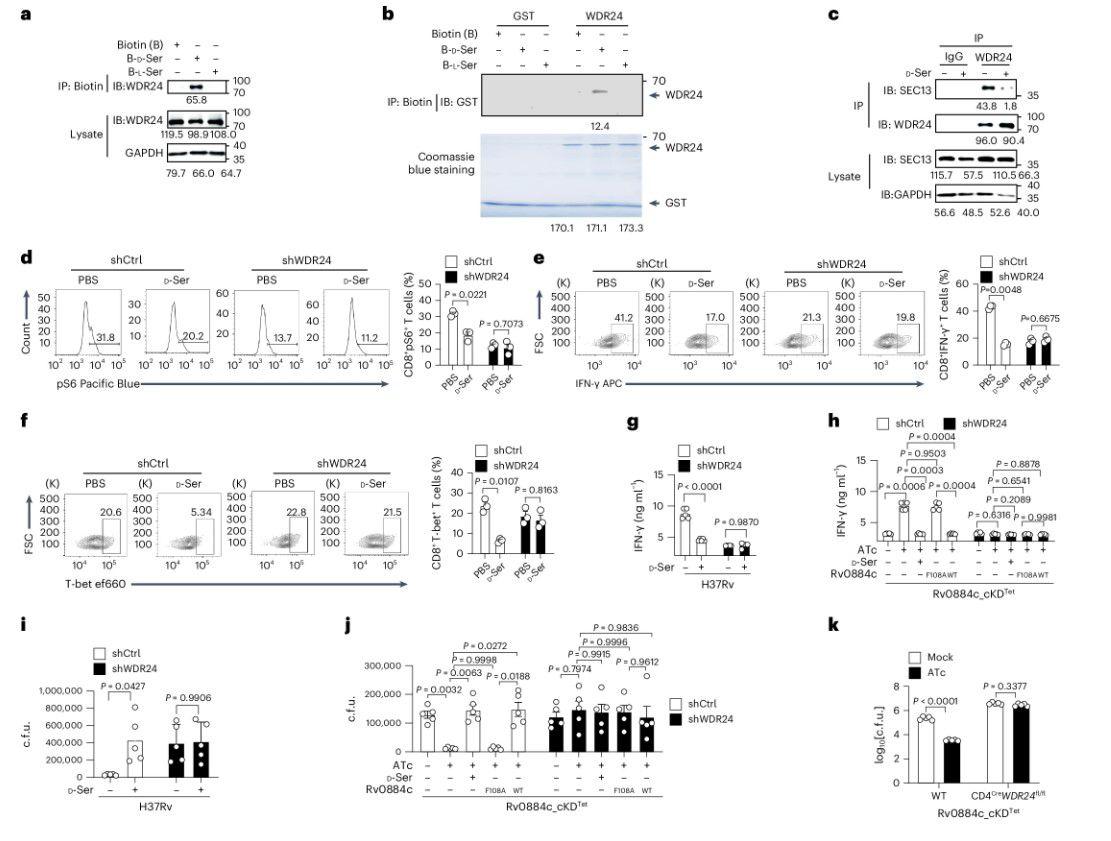 圖5、a,進行Co-IP以檢測T細胞中D-絲氨酸和WDR24之間的相互作用。印跡下方的值表示使用ImageJ進行的光密度定量。b,使用體外GST Pull-down測定檢測D-絲氨酸與WDR24的直接相互作用。印跡下方的值表示使用ImageJ進行的光密度定量。c,進行Co-IP以檢測WDR24與GATOR2(SEC13)的其他成分的相互作用,該相互作用被D-絲氨酸中斷。印跡下方的值表示使用ImageJ進行的光密度定量。d–f,WDR24敲低CD8+T細胞用PBS或D-絲氨酸處理。使用FACS分析WT CD8+T細胞或WDR24敲低CD8+T細胞中S6(d)的磷酸化、T-bet(e)和IFN-γ(f)的表達。g,i,感染H37Rv(MOI=5)1天的BMDM與TB10Rg3 T細胞或用或不用D-絲氨酸(10 mM)處理的WDR24敲低TB10Rg3 T細胞共同孵育另外3天。ELISA法檢測IFN-γ的表達(g);確定了BMDM中的細胞內CFU(i)。h,j,BMDMs用指定的Mtb菌株(MOI=5)感染1天,并與TB10Rg3 T細胞或WDR24敲低TB10Rg3 T細胞共孵育3天。采用ELISA法檢測IFN-γ的表達(h);測定了BMDM中的細胞內CFU(j)。k,CD4 Cre WDR24 fl/fl小鼠用每只小鼠約200 cfu的Rv0884c_cKD Tet氣霧感染,用或不用ATc治療4周。使用cfu測定法測定肺組織中的細菌負荷。