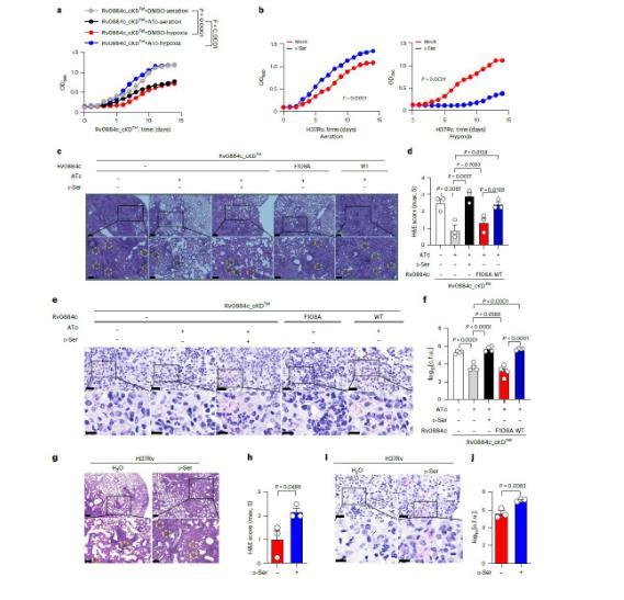 圖2、a,Rv0884c_cKD Tet在有或沒有ATc的情況下在37℃通氣或缺氧條件下培養(yǎng)14天的體外生長曲線。b,添加10 mM D-絲氨酸的H37Rv在37℃通氣(左)或缺氧(右)條件下孵育14天的體外生長曲線。c–f,C57BL/6小鼠氣溶膠感染每只小鼠約200 cfu的Rv0884c_cKD Tet(含或不含ATc)、Rv0884c_cKD Tet(含ATc和D-絲氨酸)、Rv0884c_cKD Tet+Rv0884c(F108A)(含ATc)和Rv0884c_cKD Tet+Rv0 884c與ATc。感染4周后,通過H&E染色(c;比例尺,200μm(頂部)和100μm(底部))、組織學評分(d)、抗酸染色(e;比例尺,200μm(頂部)和100μm(底部))評估感染小鼠肺切片的組織病理學。比例尺,20μm(頂部)和10μm(底部))和細菌負載(f)。使用黃色虛線圓圈標記不同條件之間的白細胞浸潤區(qū)域。g–j,C57BL/6小鼠用每只小鼠約200 cfu的H37Rv氣霧感染,然后通過飲用水向一半受感染的小鼠施用30 g l-1 D-絲氨酸。感染4周后,通過H&E染色(g;比例尺,200μm(頂部)和100μm(底部))、組織學評分(h)、抗酸染色(i;比例尺)評估感染小鼠肺切片的組織病理學。比例尺,20μm(頂部)和10μm(底部))和細菌負載(j)。使用黃色虛線圓圈標記不同條件之間的白細胞浸潤區(qū)域。