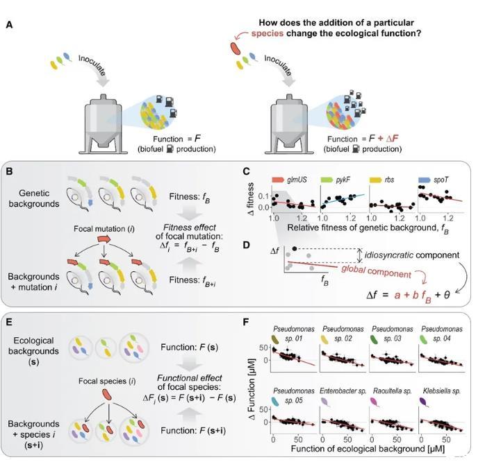 數(shù)據(jù)來自Khan等人;(D)突變的適應度效應可以分解為兩個部分:①可以從回歸中預測的全局部分;②不能從背景適應度中預測的特殊部分,由擬合的殘差表示;(E)我們假設存在一種與全局上位效應相似的生態(tài)現(xiàn)象,即在一個群落中添加一個特定的物種可能會導致群落層面功能的變化,而這種變化可以通過添加特定物種的背景群落的功能來預測;(F)在合成液體培養(yǎng)基中接種了八種不同組合的細菌分離物。這些菌落的功能被量化為48小時培養(yǎng)后Pyoverdine的分泌水平。