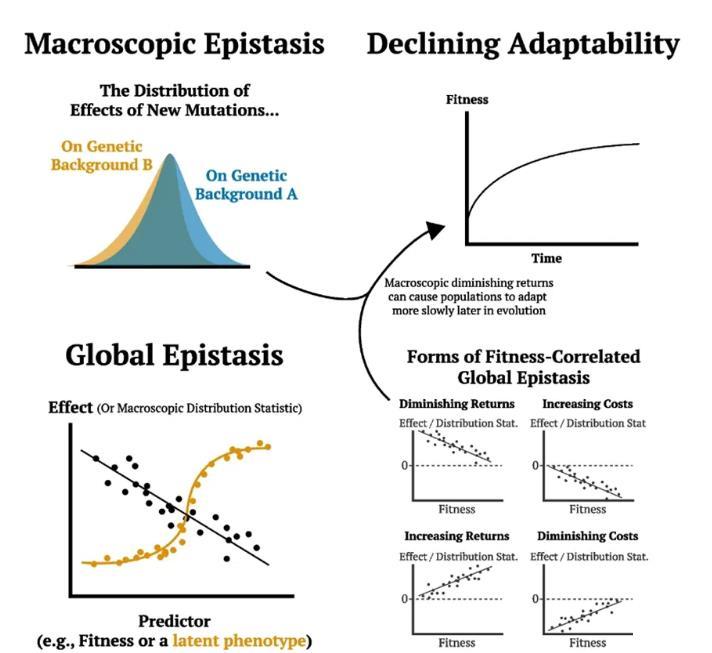 然而,盡管這些基因相互作用可能非常復雜,但它們往往會遵循某些簡單的統(tǒng)計模式。全局上位效應(Global epistasis)正是這種現(xiàn)象的表現(xiàn),即通過簡單的數(shù)學模型,可以準確地預測一個突變在不同遺傳背景中的效應。比如,當一個突變發(fā)生在適應度較高的背景中時,突變所帶來的益處往往較小,這被稱為“收益遞減的上位效應”(Diminishing returns epistasis),而這也往往是在微生物群落適應度地形(Fitness landscape)的相關研究中最常觀察到的現(xiàn)象。通過這種全局上位效應的理論,遺傳學家能夠從定量的角度更好地理解不同的基因突變在復雜基因背景下的表現(xiàn)。