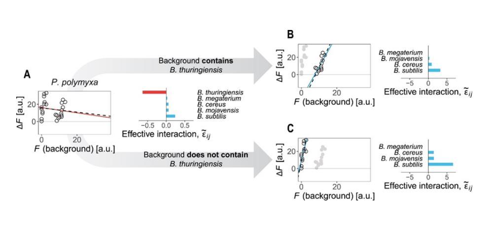 圖S14(A)當(dāng)為所有物種背景擬合單個(gè)FEE時(shí),可以觀察到負(fù)斜率,這可以通過(guò)多黏芽孢桿菌與蘇云金芽孢桿菌之間的強(qiáng)烈負(fù)有效相互作用來(lái)解釋;(B-C)當(dāng)蘇云金芽孢桿菌存在或不存在時(shí),多黏芽孢桿菌與其余物種的有效相互作用為正值,這導(dǎo)致每個(gè)分支中FEE的斜率為正。虛線表示估算的FEE,實(shí)線是數(shù)據(jù)的經(jīng)驗(yàn)性擬合結(jié)果