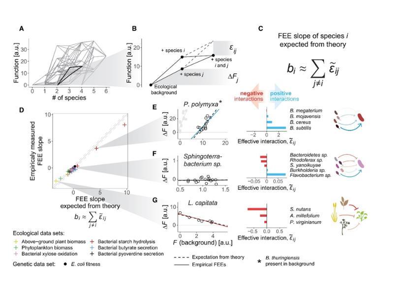 其中<εij>表示物種i和j之間的平均功能相互作用,即兩種物種共同存在時(shí),與各自獨(dú)立功能效應(yīng)的加性期望相比,其在群落中的平均功能差異(圖3B),而<ΔFj>則表示物種j在不包括物種i的生態(tài)背景下的平均功能效應(yīng)。基于數(shù)量遺傳學(xué)中的研究結(jié)果,可以推斷:FEE中物種i加入后(對(duì)應(yīng)數(shù)量遺傳學(xué)中的突變i)的斜率bi可以近似為其他所有物種j(突變j)的“有效相互作用”的和(圖3C)。簡(jiǎn)單來(lái)說(shuō),有效相互作用量化了每對(duì)物種在不同生態(tài)背景下如何共同影響群落的整體功能。通過(guò)這種方式,他們能夠量化不同物種在群落中的功能貢獻(xiàn),并探索這些貢獻(xiàn)是如何隨著物種間的相互作用而變化的。