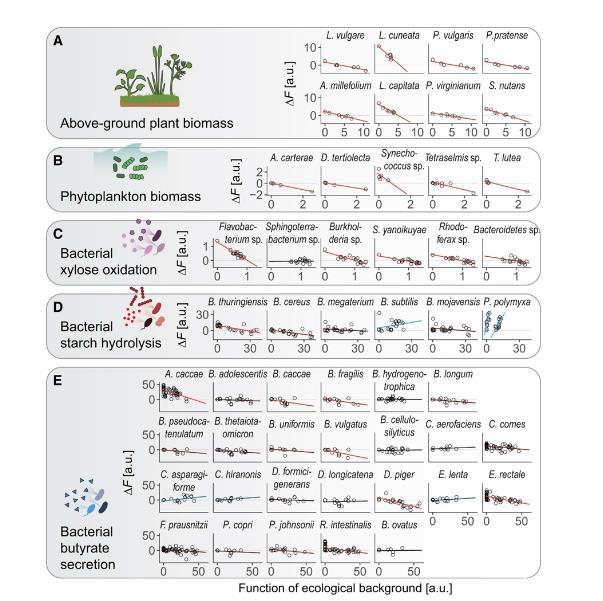 通過(guò)將一個(gè)物種添加到“生態(tài)背景”中的“功能效應(yīng)”與背景群落的功能聯(lián)系起來(lái),可以很好地反映該物種的“功能效應(yīng)”。為了進(jìn)一步拓展研究范圍,探索微生物群落功能的全局上位效應(yīng)這一現(xiàn)象是否具有普遍性,作者重新分析了多個(gè)已發(fā)表的數(shù)據(jù)集,檢驗(yàn)全局上位效應(yīng)在不同生態(tài)環(huán)境中的適用性。作者通過(guò)分析細(xì)菌、植物和浮游植物的群落,確認(rèn)這些不同生態(tài)系統(tǒng)中的群落功能也可以通過(guò)全局上位效應(yīng)的模型進(jìn)行預(yù)測(cè)(圖2)。每個(gè)數(shù)據(jù)集涉及不同的物種組合、生態(tài)條件和群落功能(如生物質(zhì)生產(chǎn)、代謝活動(dòng)、酶分泌等),但簡(jiǎn)單的統(tǒng)計(jì)模型能夠解釋各個(gè)數(shù)據(jù)集中約75%的功能效應(yīng)方差??梢钥吹剑蠖鄶?shù)物種(約50%,紅線)的FEE呈負(fù)斜率,即我們?cè)诒尘敖榻B中提及的“收益遞減”或“成本增加”現(xiàn)象,這種在群體遺傳學(xué)中也十分常見(jiàn)。而少數(shù)物種(約5%,藍(lán)線)的FEE呈正斜率,即在功能較高的背景中加入該物種會(huì)更有益(或更無(wú)害)。