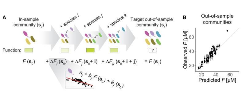 由于群落功能的預(yù)測(cè)涉及多個(gè)物種的組合,作者提出了一個(gè)迭代方法,即將每個(gè)物種的FEE與之前的群落功能預(yù)測(cè)結(jié)果進(jìn)行相加(圖4A)。由于方程(2)中殘差項(xiàng)θi(s)的存在,物種加入的順序可能會(huì)影響最終的預(yù)測(cè)結(jié)果,作者通過(guò)一種統(tǒng)計(jì)方法解決了這一問(wèn)題,使得物種不同組裝順序下的功能預(yù)測(cè)結(jié)果一致。