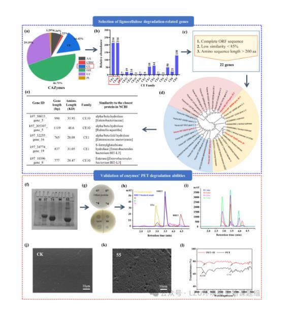 圖1.黃粉蟲腸道微生物群中PET降解酶的生物信息學(xué)篩選。黃粉蟲幼蟲。(a)黃粉蟲腸道微生物宏基因組中碳水化合物活性酶(CAZymes)主要類別的比例;(b)CE家族的相對豐度;(c)候選酶的篩選標準;(d)22個基因和已知木質(zhì)纖維素降解酶的系統(tǒng)發(fā)育樹;(e)5個選定候選酶的生物信息;(f)蛋白SDS-PAEG凝膠電泳圖;(g)在三丁酸甘油酯瓊脂板上酶周圍形成的水解圈;(h,i)PET降解產(chǎn)物MHET和TPA的HPLC色譜圖;(j,k)未處理(CK)和酶55處理PET薄膜的SEM圖;(l)未處理和酶55處理PET薄膜的FT-IR光譜圖。