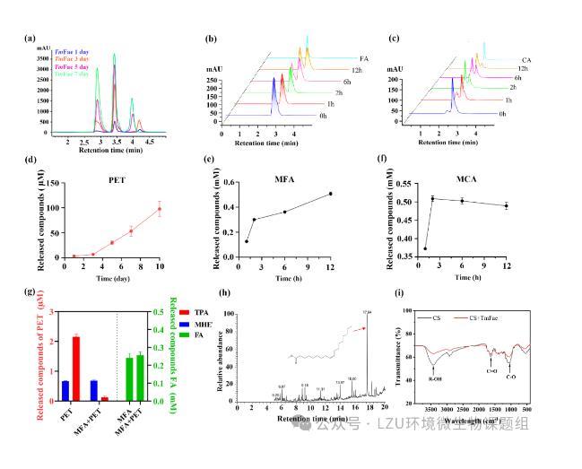 圖2.PET降解酶TmFae-PETase的表征。(a?c)TmFae-PETase在PET、MFA和MCA水解過程中釋放產(chǎn)物的HPLC譜圖;(d?f)TmFae-PETase的PET、MFA和MCA水解活性;(g)TmFae-PETase對PET和MFA底物的偏好測試;(h)TmFae-PETase處理CS降解產(chǎn)物的GC-MS色譜圖;(i)TmFae-PETase處理和未處理的CS樣品的FT-IR光譜。注:CS=玉米秸稈。