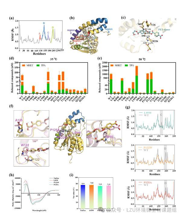圖4.基于定點(diǎn)誘變和MD模擬的TmFae-PETase催化機(jī)制。(a)具有PET復(fù)合物系統(tǒng)的TmFae-PETase的RMSF,用不同顏色突出顯示與活性位點(diǎn)區(qū)域相對(duì)應(yīng)的峰;(b)TmFae-PETase的晶體結(jié)構(gòu)顯示為卡通(淺黃色),TmFae-PETase上A-D區(qū)的配色方案對(duì)應(yīng)于圖a中所示的相同圖案;(c)使用PET二聚體的TmFae-PETase殘基Y26和M97之間的氫鍵距離;(d,e)WT和TmFae-PETase突變體在35°C和50°C時(shí)的PET水解活性;(f)WT和突變體(95W、125A和122W)的特異性駐留(L95、P125和P122)替換的結(jié)構(gòu)分析,其中WT為黃色,突變體為淺粉紅色;(g)WT與突變體L95W、P122W和P125A的RMSF比較,每個(gè)系統(tǒng)包括蛋白質(zhì)和PET二聚體;(H,I)TmFae-PETase和突變體L95W、P125A和P122W的CD色譜圖和Tm。注意:WT=野生型。