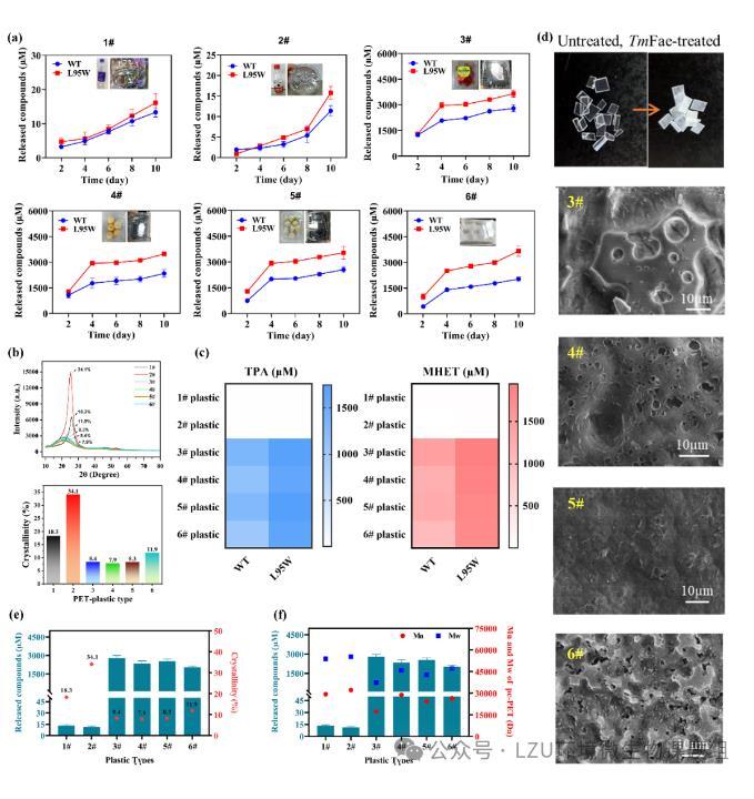 圖6.野生型TmFae-PETase和突變體L95W的性能比較。(a)WT和L95W根據(jù)產(chǎn)物釋放濃度(μM)降解六種類型的pc-PET廢物;(b)通過(guò)XRD分析確定的6種pc-PET廢物的結(jié)晶度;(c)WT和L95W在pc-PET廢料水解過(guò)程中釋放的MHET和TPA產(chǎn)物的量;(d)未經(jīng)處理的pc-PET和TmFae-PETase處理的PET廢物#至6#表面形貌的SEM觀察;(e,f)pc-PET廢料的酶降解、結(jié)晶度和分子量之間的相關(guān)性。注意:WT=野生型TmFae-PETase;L95W=突變體L95W。