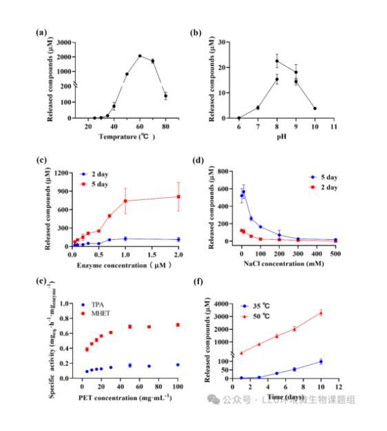 圖5.通過(guò)TmFae-PETase優(yōu)化PET降解的操作參數(shù)表征。(a)溫度對(duì)TmFae-PETase水解PET的影響;(b)pH值對(duì)30°C時(shí)PET降解的影響;(c)在30°C下,不同酶濃度在第2天和第5天釋放的累積產(chǎn)物濃度;(d)鹽度(NaCl)對(duì)30°C下PET水解的影響;(e)TmFae-PETase在50°C下對(duì)各種濃度的PET的特異性水解活性;(f)30°C和50°C下產(chǎn)物釋放的時(shí)間進(jìn)程比較(初始PET濃度為6 mg·L–1酶0.7μM)。