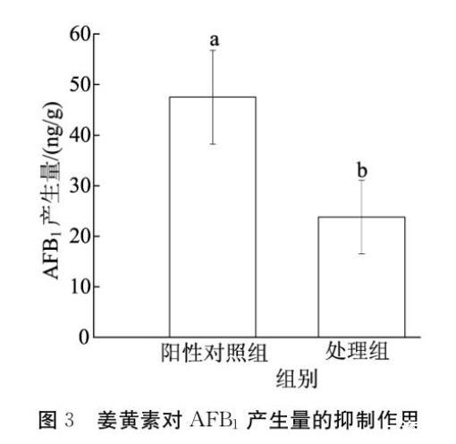由圖3可知:姜黃素處理組的黃曲霉毒素B1的產生量為23.8 ng/g,污染陽性對照組的產生量為47.5 ng/g;相比之下,姜黃素處理組毒素降低了46.9%。分析結果可知,姜黃素能夠顯著降低黃曲霉毒素B1的產生(P<0.05)。因此,姜黃素作為天然的抑菌劑具有極大的開發(fā)潛力。