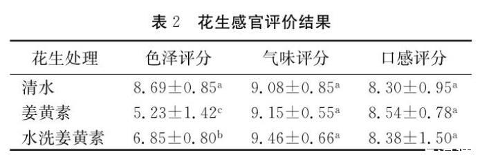 花生感官評價結果見表2所列。由表2可知,濃度為0.3 mmol/L姜黃素的加入并不會顯著影響花生的口感和氣味(P>0.05),但是對于花生的色澤產生了顯著性的影響(P<0.05),使用清水清洗后會顯著減少姜黃素對花生色澤的影響(P<0.05)。結果表明,姜黃素的加入并不會影響花生的氣味和口感,對姜黃素應用具有重要的意義。