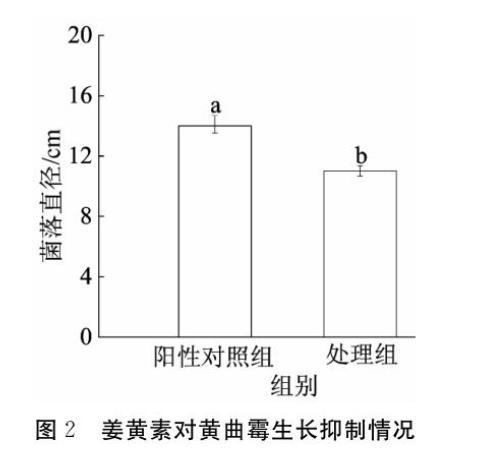 姜黃素對黃曲霉的抑制情況如圖2所示。從圖2可以看出:姜黃素處理后明顯地抑制了黃曲霉菌落的生長;相對于污染陽性對照組,黃曲霉正常生長直徑平均為14 cm,而姜黃素處理組的黃曲霉生長直徑為11 cm,抑制生長率為21.4%。可以看出,加入姜黃素對黃曲霉的生長具有抑制作用(P<0.05)。