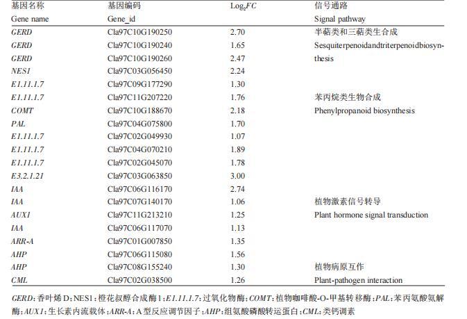 與CK4相比,2個(gè)過(guò)氧化物酶相關(guān)基因(Cla97C09G177290和Cla97C11G207220)上調(diào)了1.30和1.76倍。與CK6相比,3個(gè)過(guò)氧化物酶相關(guān)的基因(Cla97C02G049930,Cla97C04G070210和Cla97C 02G045070)被上調(diào)了1.07~1.89倍(表2)。