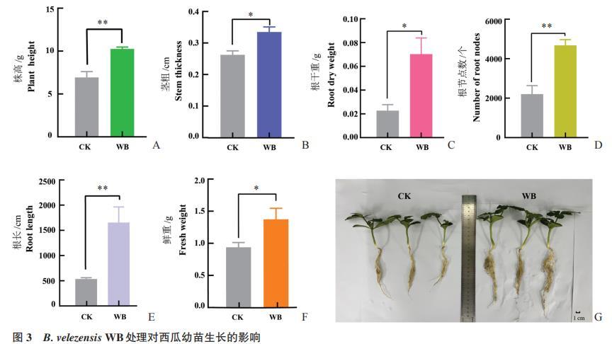 圖3 B.velezensis WB處理對(duì)西瓜幼苗生長(zhǎng)的影響
