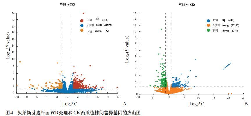 圖4貝萊斯芽孢桿菌WB處理和CK西瓜植株間差異基因的火山圖