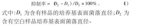 式中:D1為含有樣品的培養(yǎng)基表面菌落直徑;D2為含有空白樣品培養(yǎng)基表面菌落直徑。