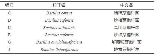 將6株在?80℃冷凍保存的芽孢桿菌于室溫下進行解凍,用接種環(huán)沾取菌液在LB營養(yǎng)瓊脂平板上劃線,在36±1℃培養(yǎng)24 h后將單菌落挑入LB肉湯中,于36±1℃培養(yǎng)24 h,完成第一次液體擴培;取200μL擴培菌液移入至新的LB肉湯,于36±1℃培養(yǎng)24 h,完成第二次活化,備用。