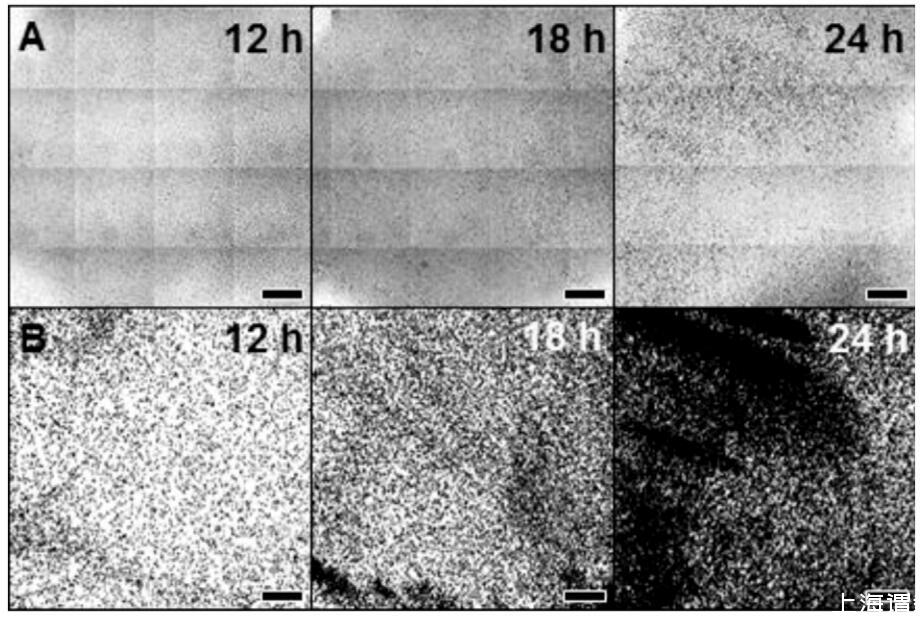 圖1:。評(píng)估Cellavista設(shè)備獲得的生物膜圖像的時(shí)間過程(12小時(shí)、18小時(shí)和24小時(shí))。(A)從一口井中的生物膜中無梗細(xì)胞的所有原生圖像中剪下馬賽克。(B)同一井的評(píng)價(jià)二值圖像;黑色區(qū)域表示粘附細(xì)胞定植的區(qū)域。比例尺=400μm。