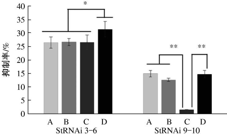 由圖1可以看出,野生型菌株和StSte12 RNAi陽(yáng)性轉(zhuǎn)化子在4種碳源培養(yǎng)基上均能生長(zhǎng),并且在8 d的培養(yǎng)時(shí)間內(nèi),一定程度上菌落直徑隨培養(yǎng)時(shí)間呈線性增加(R2>0.99),在4種碳源培養(yǎng)基上StSte12 RNAi陽(yáng)性轉(zhuǎn)化子的生長(zhǎng)速度均低于野生型菌株01-23(圖1)。以野生型菌株為對(duì)照,計(jì)算StSte12 RNAi陽(yáng)性轉(zhuǎn)化子的菌絲生長(zhǎng)抑制率(圖2),結(jié)果發(fā)現(xiàn),StSte12 RNAi陽(yáng)性轉(zhuǎn)化子StRNAi 3-6的菌絲生長(zhǎng)受抑制程度顯著高于StSte12 RNAi陽(yáng)性轉(zhuǎn)化子StRNAi 9-10(P<0.05),并且抑制程度受到碳源種類(lèi)的顯著影響??扇苄缘矸蹖?duì)轉(zhuǎn)化子StRNAi 3-6的抑制率(31.4%)顯著高于其他3種碳源(平均26.5%),而葡萄糖、乳糖和可溶性淀粉等3種碳源對(duì)轉(zhuǎn)化子StRNAi 9-10的抑制率(平均14.1%)極顯著高于蔗糖(1.5%)。以蔗糖為碳源時(shí),StRNAi 9-10的菌絲生長(zhǎng)速率與野生型菌株01-23沒(méi)有顯著差異(P>0.05)。以上試驗(yàn)結(jié)果表明,StSte12基因的表達(dá)水平與菌絲生長(zhǎng)速率有關(guān),即StSte12基因調(diào)控著玉米大斑病菌菌絲的生長(zhǎng),但其調(diào)控作用受環(huán)境中的碳源種類(lèi)影響,對(duì)于StSte12基因表達(dá)水平較低的轉(zhuǎn)化子StRNAi 3-6,不同碳源之間的影響差異顯著,而對(duì)于StSte12基因表達(dá)水平較高的轉(zhuǎn)化子StRNAi 9-10,不同碳源之間的影響差異極顯著。4種碳源中,總體上可溶性淀粉的影響最強(qiáng),蔗糖的影響最弱。