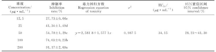 由表1可知,納米ZnO-Ag復(fù)合材料能夠抑制小麥根腐菌菌絲的生長,菌絲生長抑制率隨材料濃度的升高而增大,200μg·mL-1ZnO-Ag對病菌菌絲生長抑制率高達(dá)91.17%;不同濃度復(fù)合材料處理的病菌菌絲生長抑制率間差異均顯著(P<0.05)。納米ZnO-Ag對病菌的毒力回歸方程為y=2.581 8+1.577 1x,EC50=34.15μg·mL-1,說明ZnO-Ag復(fù)合材料對小麥根腐病菌的抑制作用較強。