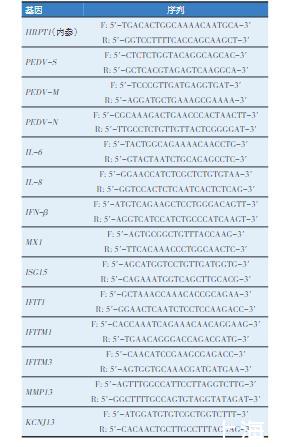 ②基因相對表達量的測定方法。處理結(jié)束后收集細胞,提取RNA,檢測不同處理方式3D4/21細胞PEDV-S、PEDV-M、PEDV-N、IL-6、IL-8、IFN-β、MX1、ISG15、IFIT1、IFITM1、IFITM3、MMP13、KCNJ13等基因的相對表達量,引物序列見表4,以HRPT1作為內(nèi)參基因,數(shù)據(jù)分析及表達量的計算參考Fu等的方法。