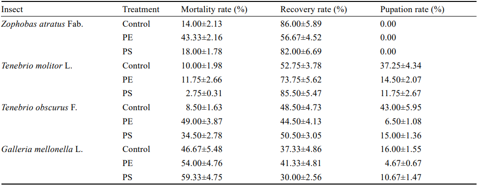 表2實(shí)驗(yàn)結(jié)束時(shí)(28 d)4種昆蟲(chóng)幼蟲(chóng)存活率、死亡率和化蛹率