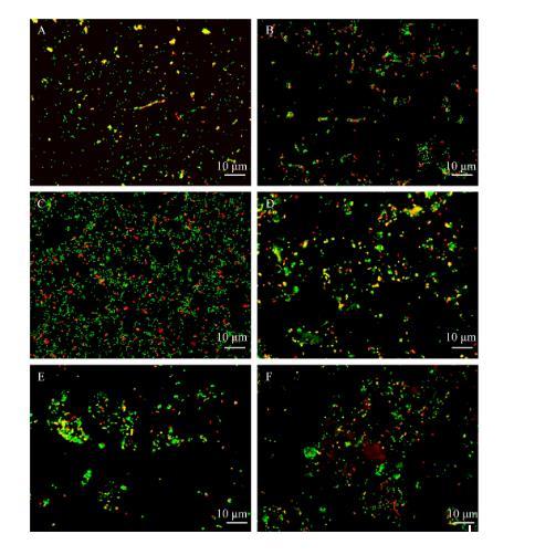 圖3昆蟲(chóng)幼蟲(chóng)腸道菌群熒光鏡檢重疊圖像A、B、C、D、E和F是使用不同寡核苷酸探針進(jìn)行熒光原位雜交的重疊圖像,黃色細(xì)胞是由與單個(gè)FISH探針雜交的細(xì)胞(紅色)和同一顯微鏡視野中DAPI染色的細(xì)胞(綠色)重疊而成.A:ARCH915.B:Bet42a.C:GAM42a.D:LGC354abc.E:Lab.F:Rotcl1
