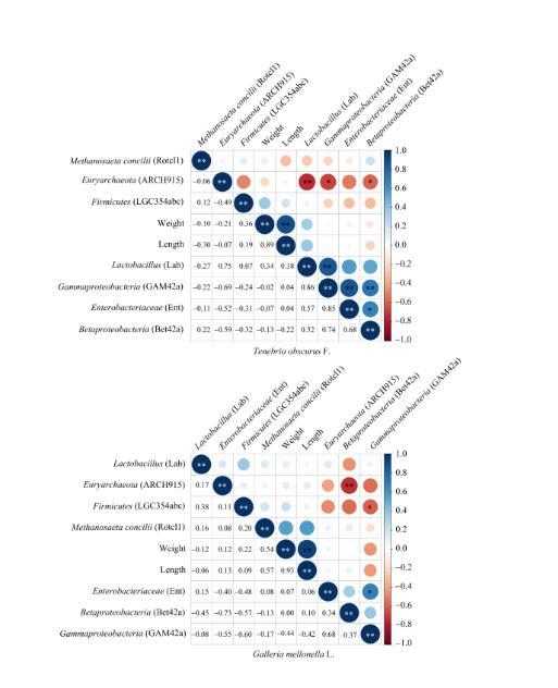 通過(guò)Pearson分析對(duì)4種昆蟲(chóng)幼蟲(chóng)的體重、體長(zhǎng)以及腸道微生物菌群的豐度進(jìn)行了相關(guān)性分析,結(jié)果表明(圖6),大麥蟲(chóng)的體重和體長(zhǎng)與β-變形菌綱均存在顯著負(fù)相關(guān),黃粉蟲(chóng)體重與廣古菌門(mén)存在顯著負(fù)相關(guān)(P<0.05),而大蠟螟和黑粉蟲(chóng)的體重、體長(zhǎng)與其腸道微生物菌群無(wú)顯著相關(guān)性(P>0.05)。