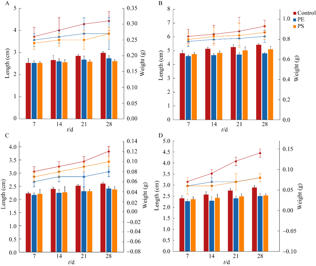 在28 d飼養(yǎng)過(guò)程中取食塑料和麥麩的4種昆蟲(chóng)的體重和體長(zhǎng)呈不同程度的增長(zhǎng)(圖2)。除麥麩組外,體重增長(zhǎng)率最高的是黑粉蟲(chóng)PS組,每只由7 d的(0.07±0.01)g平均增長(zhǎng)至28 d的(0.10±0.01)g,增長(zhǎng)率為42.86%。其次是黃粉蟲(chóng)PE組(33.33%)、黃粉蟲(chóng)PS組(33.33%)、黑粉蟲(chóng)PE組(33.33%)、大蠟螟PS組(12.50%)、大麥蟲(chóng)PS組(8.75%)、大蠟螟PE組(8.00%)和大麥蟲(chóng)PE組(6.41%)。除麥麩組外,體長(zhǎng)增長(zhǎng)率最高的是黑粉蟲(chóng)PE組,每只由7 d的(2.17±0.08)cm增長(zhǎng)至28 d的(2.41±0.08)cm,增長(zhǎng)率為11.06%,其次是黃粉蟲(chóng)PE組(10.13%)、大蠟螟PE組(8.30%)、黑粉蟲(chóng)PS組(7.69%)、大麥蟲(chóng)PS組(7.37%)、黃粉蟲(chóng)PS組(7.20%)、大麥蟲(chóng)PE組(4.34%)、大蠟螟PS組(3.16%)。實(shí)驗(yàn)結(jié)束時(shí),大麥蟲(chóng)和黃粉蟲(chóng)PE組和PS組的體重均顯著(P<0.05)低于對(duì)照組,取食塑料PE和PS后的大麥蟲(chóng)體重?zé)o顯著(P>0.05)差異。黑粉蟲(chóng)PE組體重顯著(P<0.05)低于PS和對(duì)照組,而大蠟螟PE組體重與PS組無(wú)顯著(P>0.05)差異。