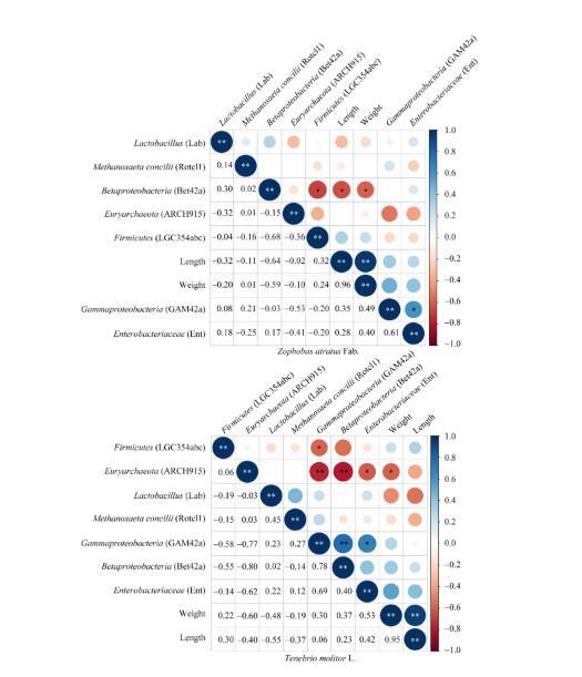 圖6昆蟲(chóng)體重、體長(zhǎng)和腸道菌群的相關(guān)性分析