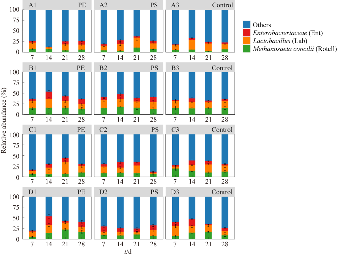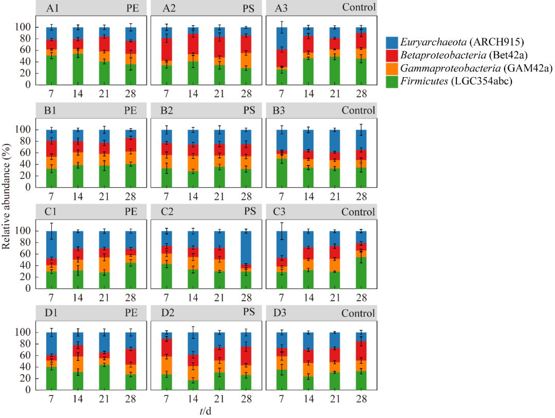 從飼喂麥麩改為單一的PE或PS對(duì)昆蟲(chóng)腸道微生物主要菌群影響的程度不同,影響的時(shí)間不同(圖4、圖5)。與麥麩對(duì)照組相比,飼喂PE的大麥蟲(chóng)腸道中厚壁菌門(mén)(從26.45%升至50.88%)和γ‐變形菌綱(從4.62%升至10.72%)在7 d時(shí)顯著(P<0.05)升高,乳桿菌在14 d時(shí)顯著降低(從22.69%降至4.20%),廣古菌門(mén)(從9.99%升至23.46%)和腸桿菌(從3.66%升至8.05%)在28 d時(shí)顯著(P<0.05)升高(圖4A1,圖5A1)。飼喂PS的大麥蟲(chóng)腸道中β-變形菌綱(從19.46%升至35.64%)和鬃毛甲烷菌(從2.27%升至10.76%)在21 d時(shí)顯著(P<0.05)升高,而厚壁菌門(mén)(從18.88%降至16.90%)則顯著(P<0.05)降低(圖4A2,圖5A2)。黃粉蟲(chóng)腸道中,PE組乳桿菌(15.42%升至17.43%),鬃毛甲烷菌(從14.22%升至18.42%)和腸桿菌(從8.23%升至16.96%)在14 d時(shí)顯著(P<0.05)升高(圖5B1),而廣古菌門(mén)(從36.23%降至19.83%)顯著(P<0.05)降低,21 d時(shí)的腸桿菌(11.52%)顯著(P<0.05)高于對(duì)照組(4.16%),而28 d的廣古菌門(mén)(13.92%)則顯著(P<0.05)低于對(duì)照組(34.80%)(圖4B1,圖5B1)。飼喂PS在7 d時(shí)顯著(P<0.05)升高了黃粉蟲(chóng)腸道中的腸桿菌(從2.56%升至7.27%),在14 d時(shí)顯著(P<0.05)升高了γ‐變形菌綱(從14.37%升至26.81%)和鬃毛甲烷菌(從14.22%升至18.42%)的豐度(圖4B2,圖5B2)。飼喂PE對(duì)黑粉蟲(chóng)腸道菌群的影響較小,只有鬃毛甲烷菌(6.24%)在14 d時(shí)顯著(P<0.05)低于對(duì)照組(14.35%)(圖5C1)。飼喂PS在7 d時(shí)顯著(P<0.05)升高了黑粉蟲(chóng)腸道中γ‐變形菌綱(從9.35%升至18.11%)和乳桿菌(從4.80%升至15.90%)的豐度,在28 d時(shí)顯著(P<0.05)升高了廣古菌門(mén)(從21.10%升至58.05%)的豐度,同時(shí)顯著(P<0.05)降低了厚壁菌門(mén)(從54.93%降至29.70%)和鬃毛甲烷菌(從12.25%降至6.01%)的豐度(圖4C2,圖5C2)。飼喂PE在21 d時(shí)顯著(P<0.05)降低了大蠟螟腸道β-變形菌綱(從24.24%降至10.14%)的豐度,在28 d顯著(P<0.05)升高了廣古菌門(mén)(從15.45%升至28.43%)的豐度(圖4D1)。飼喂PS顯著(P<0.05)降低了大蠟螟腸道7 d乳桿菌(從23.41%降至7.40%)的豐度(圖5D2)。
