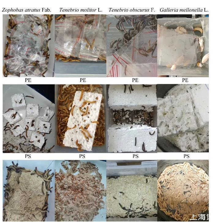 圖1四種昆蟲(chóng)幼蟲(chóng)分別取食聚乙烯(PE)、聚苯乙烯(PS)和麥麩(control)的圖像