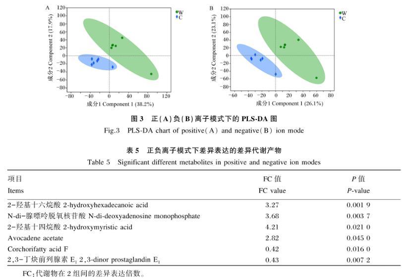 本研究采用判別分析的直觀展示分類效果較好的PLS-DA方法對(duì)差異代謝產(chǎn)物進(jìn)行分析。如圖3所示,2種模式下(正負(fù)離子),2組樣品完全分開(kāi)且分離度較大,說(shuō)明飼糧中添加類腸膜魏斯氏菌后,豬糞便中代謝物的組成發(fā)生了改變。