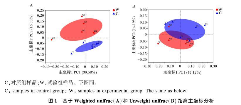 通過(guò)Weighted Unifrac(圖1-A)和Unweight unifrac(圖1-B)的加權(quán)距離主坐標(biāo)對(duì)試驗(yàn)數(shù)據(jù)進(jìn)行分析。圖1-A中2組的樣品完全分開(kāi),說(shuō)明當(dāng)綜合主要物種的種類和相對(duì)豐度等因素進(jìn)行分析時(shí),添加類腸膜魏斯氏菌后,糞菌結(jié)構(gòu)中主要部分發(fā)生顯著變化。圖1-B中2組樣品未完全分開(kāi),部分重疊,說(shuō)明當(dāng)忽略物種的相對(duì)豐度,而綜合物種的多樣性和物種間的進(jìn)化關(guān)系進(jìn)行分析時(shí),2組樣品既有相似部分,又有不同部分,添加類腸膜魏斯氏菌對(duì)糞菌中相對(duì)豐度較小的菌影響較小。綜上所述,飼糧中添加類腸膜魏斯氏菌后,豬的糞菌中優(yōu)勢(shì)菌群組成發(fā)生了改變。