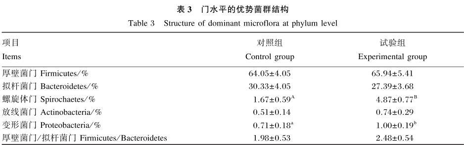 如表3所示,2組樣品主要聚類在3個(gè)門(mén):厚壁菌門(mén)、擬桿菌門(mén)和螺旋體門(mén)。結(jié)果顯示,與對(duì)照組相比,添加類腸膜魏斯氏菌極顯著提高了螺旋體門(mén)相對(duì)豐度(P<0.01),顯著提高了變形菌門(mén)相對(duì)豐度(P<0.05);提高了厚壁菌門(mén)/擬桿菌門(mén)的比值,但差異不顯著(P>0.05);降低了擬桿菌門(mén)的相對(duì)豐度,但差異不顯著(P>0.05)。