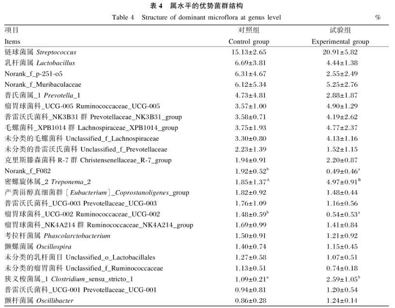 如表4所示,2組中的相對(duì)豐度最高的菌屬均為鏈球菌屬。試驗(yàn)組的狹義梭菌屬_1(P<0.05)和密螺旋體屬_2(P<0.01)的相對(duì)豐度顯著或極顯著高于對(duì)照組,Norank_f_F082和瘤胃球菌科_UCG-002相對(duì)豐度則顯著低于對(duì)照組(P<0.05)。