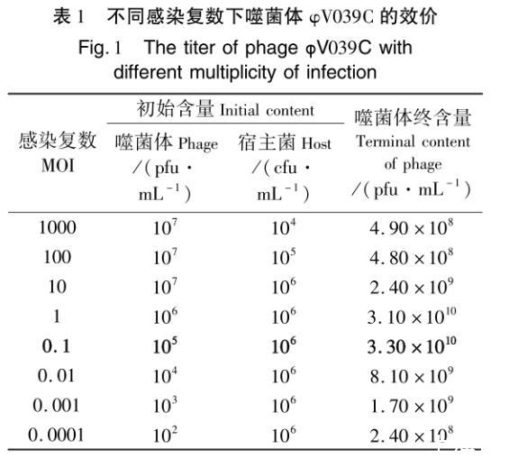 表1不同感染復(fù)數(shù)下噬菌體φV039C的效價