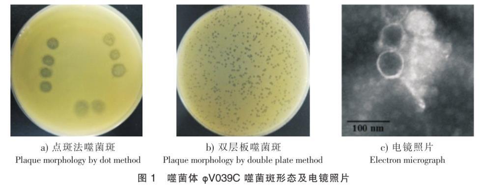 按照不同的感染復(fù)數(shù)(MOI)混合噬菌體和宿主菌液培養(yǎng)8 h之后,用雙層板測定各個MOI的效價。實驗結(jié)果(見表1)表明,當(dāng)噬菌體與宿主比值為0.1時,噬菌體效價最高,能夠達到3.34×1010pfu/mL,因此噬菌體φV039C的最佳感染復(fù)數(shù)為0.1。