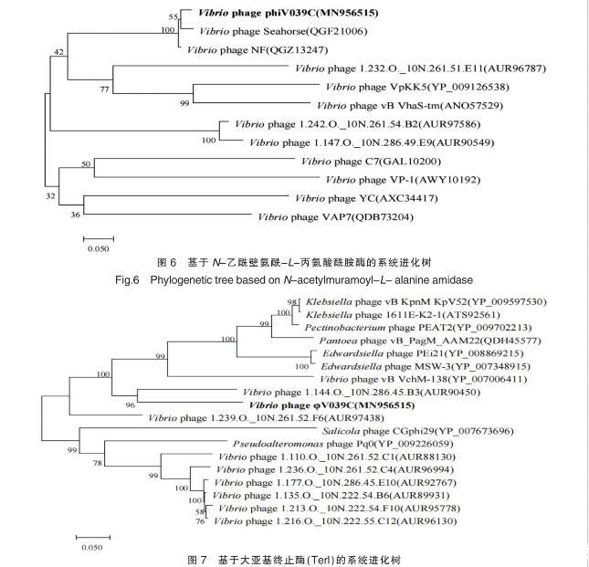 為探究噬菌體φV039C與其他噬菌體的進化關(guān)系,選擇N-乙酰壁氨酰-L-丙氨酸酰胺酶(ORF6)和大亞基終止酶(ORF19)兩種蛋白進行系統(tǒng)進化樹的構(gòu)建。從基于N-乙酰壁氨酰-L-丙氨酸酰胺酶構(gòu)建的系統(tǒng)進化樹可以看出,φV039C與副溶血弧菌噬菌體Seahorse、溶藻弧菌噬菌體NF有著較近的親緣關(guān)系(見圖6),這與全基因組的blast結(jié)果相近。而從基于大亞基終止酶構(gòu)建的系統(tǒng)進化樹可以看出,噬菌體φV039C與燦爛弧菌噬菌體1.144.0._10N.286.45.B3在同一分支上(見圖7),后者在分類上也同樣屬于長尾噬菌體科。綜上所述,噬菌體φV039C在分類上應(yīng)歸屬有尾噬菌體目長尾噬菌體科。