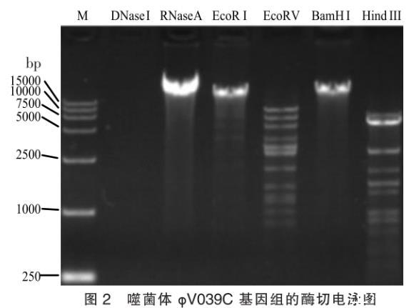 酶切產(chǎn)物電泳結(jié)果(見圖2)顯示:噬菌體φV039C的基因組能被DNase I降解,但不能被RNase A降解,說明其基因組類型是DNA;電泳結(jié)果也表明其基因組上有EcoR V、HindⅢ和EcoR I的酶切位點,但沒有BamH I酶切位點。因此,噬菌體φV039C基因組類型屬于dsDNA。