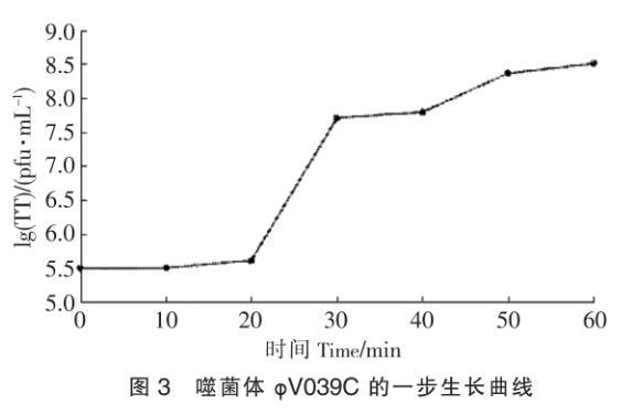 由噬菌體φV039C的一步生長曲線(見圖3)可得出,噬菌體與宿主菌混合培養(yǎng)20 min,效價無明顯變化,因此噬菌體φV039C的潛伏期為20 min;20—30 min噬菌體效價呈現(xiàn)上升趨勢;30 min后噬菌體效價穩(wěn)定。由此得,噬菌體爆發(fā)期為培養(yǎng)后10 min。噬菌體裂解量=爆發(fā)期末期噬菌體密度/初始受感染宿主菌密度=(5.06×107)/(3.10×105)=163 pfu/cell。
