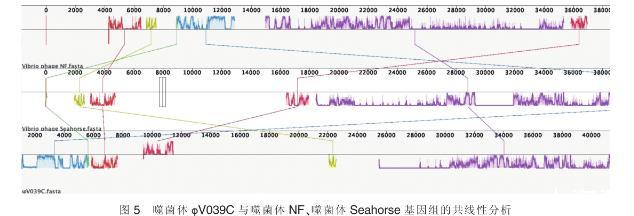 用NCBI網(wǎng)站的blastn(megablast)程序進行噬菌體φV039C的基因序列比對,在得到的同源序列中,噬菌體φV039C與溶藻弧菌噬菌體NF(MN812722)、副溶血弧菌噬菌體Seahorse(MN512538)的比對覆蓋率最高,同為11%,一致性分別為92.2%和93.3%,即從基因組來看,噬菌體φV039C與這二者最為接近。二者在分類上均屬于有尾噬菌體目長尾噬菌體科。噬菌體φV039C與溶藻弧菌噬菌體PVA1(KJ395778)的覆蓋率次之,為2%,其余檢索結(jié)果覆蓋率僅為1%。使用Mauve軟件對3個基因組進行共線性比對分析(見圖5),發(fā)現(xiàn)三者相互之間存在5個同源片段,但位置、順序不同,相似性也不高。