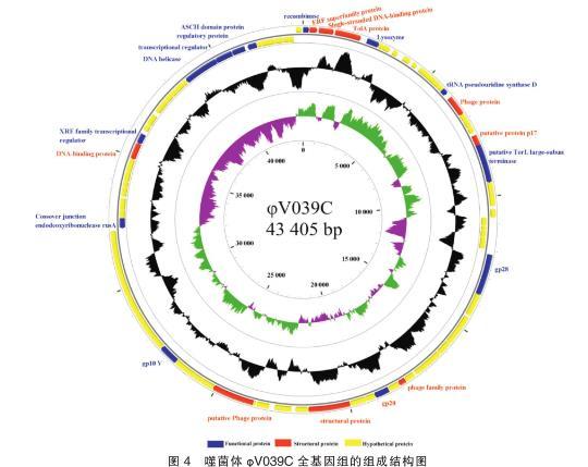 第三代單分子測序平臺測序結(jié)果表明,噬菌體φV039C的基因組(GenBank登錄號MN956515)為環(huán)形雙鏈DNA,全長為43 405 bp,G+C含量為42.95%(見圖4)。共注釋得到77個開放閱讀框(open reading frame,ORF)。其中,已知功能閱讀框有17個,假想蛋白有20個,未注釋出的閱讀框有40個。核酸序列長度在213~2436 bp,對應(yīng)的蛋白質(zhì)序列長度在71~812。所有ORF共含有40 870 bp的堿基,基因組的基因密度為94.20%。