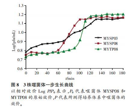 以相對效價LogP,Pn表示,代表噬茵體MYSP08和MYI1Po8的原始效價.尸代表所測得培養(yǎng)體系中噬茵體的效價。
