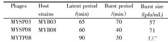 由3株噬菌體的一步生長曲線(圖8)可以看出,當MOI=10℃,15℃振蕩培養(yǎng),3株噬菌體表現(xiàn)出明顯不同的潛伏期、裂解期,MYTP08尤為突出,其潛伏期約90 min,裂解期約30 min,在3株噬菌體中潛伏期最長而裂解期最短。實驗中被感染的宿主菌的初始濃度為2*107cfu/mL,根據(jù)公式:裂解量=裂解末期噬菌體效價衣感染初期宿主菌濃度,可以計算得出3株噬菌體感染其宿主菌的裂解量分別是57、71和137(表1)。