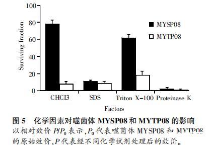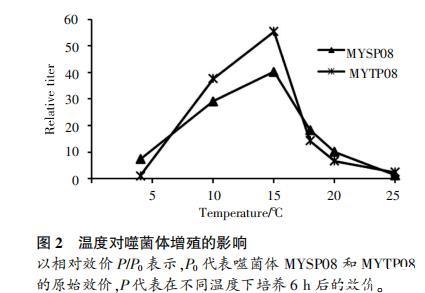 以相對效價P,Pn表示,Pn代表噬茵體MYSPo8和MYTP08的原始效價.P代表在不同溫度下培養(yǎng)6h后的效價。